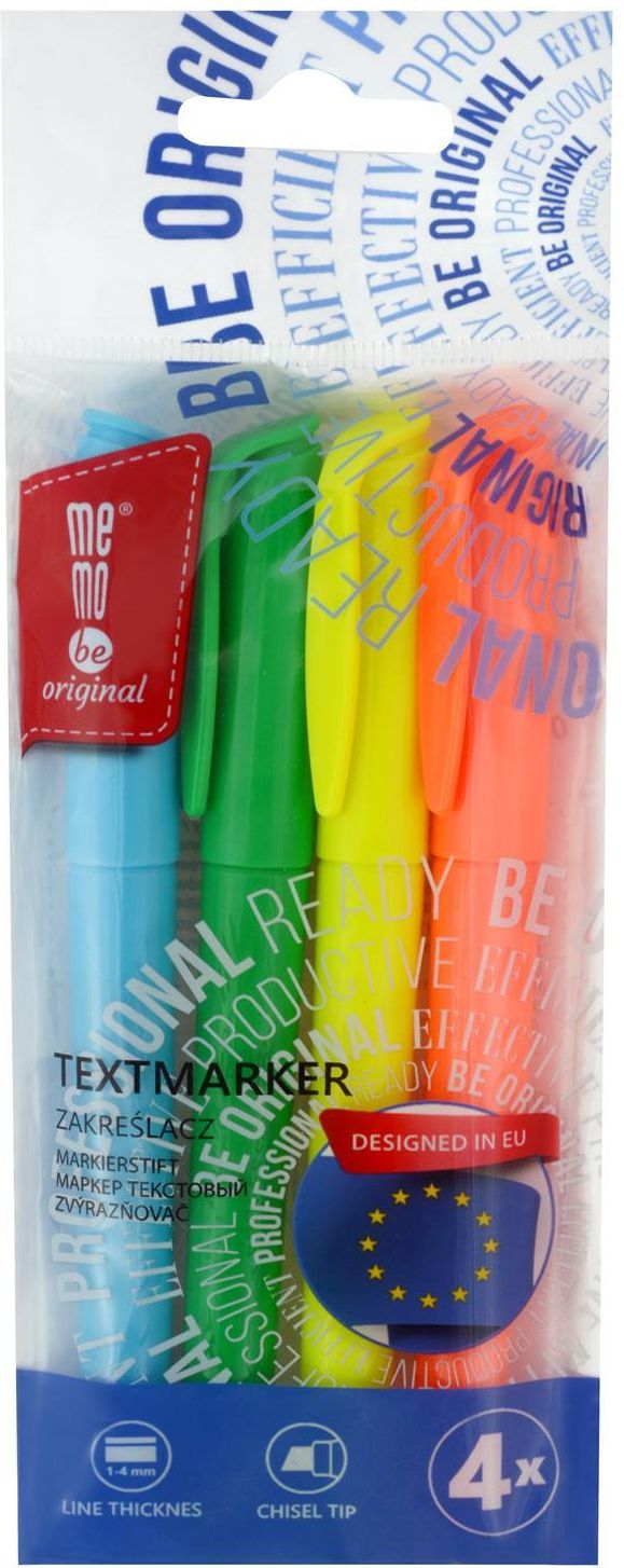 Zakreślacze MemoBe. Zakreślacze w pisaku ze ściętą końcówką. Idealne do zakreślania fragmentów tekstu i notatek. Obudowa wykonana z tworzywa w kolorze tuszu, z zatyczką z klipsem. Tusz na bazie wody w jasnych, intensywnych kolorach neonowych. Grubość linii pisania 1-4 mm. Zestaw 4 szt. w różnych kolorach w etui z zawieszką. Wymiary: 150x73 mm Opakowanie: blister