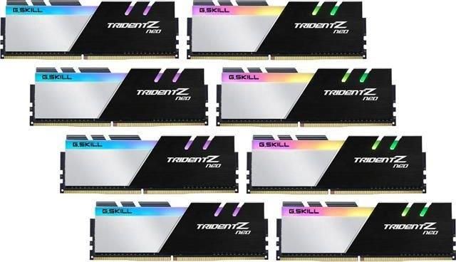 G.Skill Trident Z Neo F4-3600C14Q2-64GTZNB, 64 GB, 8 x 8 GB, DDR4, 3600 MHz 64 GB (8 x 8 GB) - DDR4 - 3600 MHz - Non-ECC - Unbuffered - XMP 2.0 - 1.2 V Group Memory Modules Manufacturer G.Skill Manufacturer item no. F4-3600C14Q2-64GTZNB EAN/UPC 4713294224279 Description Engineered and optimized for full compatibility on the latest AMD Ryzen Threadripper 3000 series processors on AMD TRX40 chipset motherboards, Trident Z Neo brings unparalleled memory performance and vibrant RGB lighting to any gaming PC or workstation with AMD Ryzen 3000 CPUs and AMD X570 motherboards. Engineered and optimized for full compatibility on the latest AMD Ryzen 3000 series processors on AMD X570 chipset motherboards, Trident Z Neo brings unparalleled memory performance and vibrant RGB lighting to any gaming PC or workstation with AMD Ryzen 3000 CPUs and AMD X570 motherboards. Optimized DDR4 Performance for AMD Ryzen 3000 Engineered to scale memory performance with the latest AMD Ryzen 3000 series processors on the X570 platform, Trident Z Neo is optimized to push the platform to its maximum speed. Dual-Tone Design Designed with a contrast of black brushed aluminum and powder-coated silver, the Trident Z Neo dual-toned heatspreader adds power and boldness to your next-gen build. Sleek Beveled Edge Inspired by the racing stripes of sports cars and supercars, Trident Z Neo features a beveled edge along the top of the signature tri-fin design with the asymmetrical slant to achieve a sleek and clean look. Powerful Overclocked Performance Crafted with hand-screened memory ICs and custom 10-layer PCBs, each and every module is made for maintaining the best signal integrity to achieve fast overclocking performance. Platform Compatibility Tested across a wide range of motherboards to strict quality standards, Trident Z Neo memory kits are built for reliability, stability, and compatibility. Light It Up With RGB Software Fully control and customize the 8-zone RGB lighting through the downloadable Trident Z Lighting Control software. Main features General Component for PC/Server Internal memory 64 GB Memory layout (modules x size) 8 x 8 GB Internal memory type DDR4 Memory clock speed 3600 MHz CAS latency 14