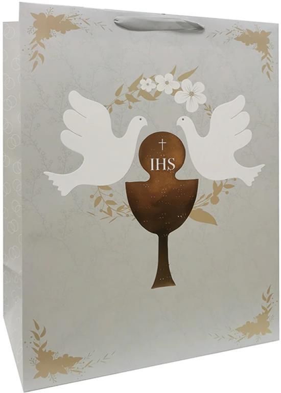 - torebka prezentowa - okazja: Pierwsza Komunia Święta - ozdobiona motywem kielicha z Hostią z białymi gołębiami - uchwyty wykonane ze srebrnej tasiemki - materiał: papier - gramatura: 210 g/m2 - wymiary: 42x59x23cm