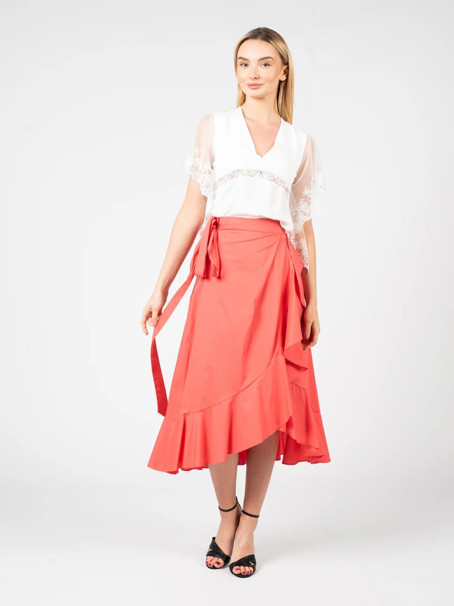 Ten elegancki model podkreśli Twoją sylwetkę, oferując idealne połączenie komfortu i stylu, dzięki starannie skrojonej linii, która idealnie dopasowuje się do ciała. O długość midi, która jest zarówno klasyczna, jak i na czasie, sprawia, że jest doskonałym wyborem na różne okazje, od biznesowych spotkań po eleganckie przyjęcia. Kopertowy krój to synonim kobiecości i elegancji, a także świetny sposób na podkreślenie talii i dodanie gracji każdemu ruchowi. Ozdobiona falbanami, które dodają lekkości i romantycznego charakteru, sprawiając, że każde wyjście staje się okazją do zaprezentowania wyjątkowego stylu. Z przodu ozdobne rozcięcie to nie tylko modny akcent, ale również praktyczny element, który zapewnia większą swobodę ruchów. Z przodu firmowy detal to dyskretny, ale rozpoznawalny znak jakości, który dodaje prestiżu i podkreśla ekskluzywny charakter. Wykonana z wysokiej jakości tkaniny, która zapewnia trwałość i wygodę noszenia, a także sprawia, że pięknie układa się na ciele. Wyprodukowana we Włoszech, co gwarantuje nie tylko doskonałe rzemiosło, ale także uwzględnienie najnowszych trendów w europejskim designie.