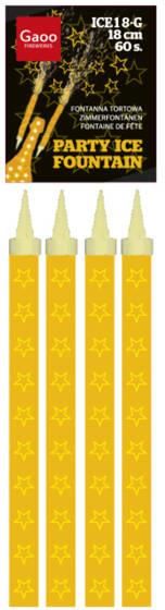 Fontanny tortowe Party Ice Foutain 18 cm/60 sek. - informacje podstawowe Zestaw 4 fontann tortowych w złotej poligrafii ICE18-GOLD marki Gaoo. Klasyczna fontanna tortowa prezentująca złote iskry. W opakowaniu znajduje się 6 sztuk fontann tortowych o długości 18 cm. Czas działania wynosi ok. 60 sekund. Produkt posiada certyfikat CE: Klasa F1 Efekty tego produktu: złote iskry Nasz test fontann tortowych ICE18-GOLD. Opinia pirotechnika: Fontanny tortowe ICE18-GOLD, prezentują gęsty złoty płomień zwieńczony iskerkami o tym samym kolorze. Produkt ten przeznaczony jest głównie do dekoracji tortów lub innych dań gastronomicznych. Czas palenia fontanny wynosi aż 60 sekund. Atuty produktu: długi czas palenia - 60 sek. długi rozmiar korpusu - 18 cm długości Praktyczne informacje dotyczące użycia fontann tortowych ICE18-GOLD: Fontanny tortowe, podobnie jak każdy inny wyrób pirotechniczny, rekomendowane są do użytku na wolnym powietrzu, wyłącznie przez osoby pełnoletnie. Minimalna bezpieczna odległość wynosi 1 metr od odpalonego produktu. Umieść FONTANNĘ TORTOWĄ ostrym końcem w miękkim, niepalnym podłożu. Zwróć uwagę, że fontanna umieszczona jest pionowo bez ryzyka przewrócenia. Stojąc z boku zapal od góry system inicjujący (papier uszczelniający) i oddal się natychmiast na bezpieczną odległość. Wypaloną fontannę tortową po ostygnięciu wyrzuć do odpadów zmieszanych.