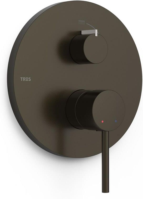 TRES STUDY EXCLUSIVE bateria wannowo-natryskowa podtynkowa, czarny brąz Gwarancja Producent udziela 5-letniej gwarancji na baterie oraz 2 lata na pozostałe elementy. Główne cechy: - kolor: czarny brąz - rodzaj: wannowo-natryskowa - typ: jednouchwytowa - montaż: podtynkowa - automatyczny przełącznik natrysk/wanna - zawiera płytę dekoracyjną, uchwyt, pokrętło i ukrytą śrubę mocującą - uzupełnienie do wpuszczanego korpusu Rapid-box Dane techniczne: - średnica rozety: 213 mm W zestawie brak elementu podtynkowego TRES RAPID BOX (20828110), który należy zakupić oddzielnie.