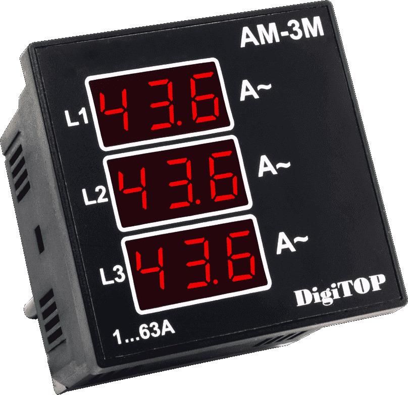 Amperomierz cyfrowy AM-3M – przeznaczony jest do pomiaru prądu przemiennego o częstotliwości 50Hz w sieci trójfazowej z wartościami prądu wyświetlanymi na cyfrowych wskaźnikach LED. Pomiar natężenia prądu odbywa się za pomocą zewnętrznych przekładników prądowych (dostarczanych w komplecie). Wykonanie — skrzynka. Specyfikacje Prąd pomiarowy, A: 1-63 Liczba faz pomiarowych: 3 Napięcie zasilania, V: ~220 (± 10%), 50Hz Przekładnik prądowy: Zewnętrzny Błąd pomiaru, %, max: 1 Stopień ochrony: IP20 Wycięcie, mm: 68х68
