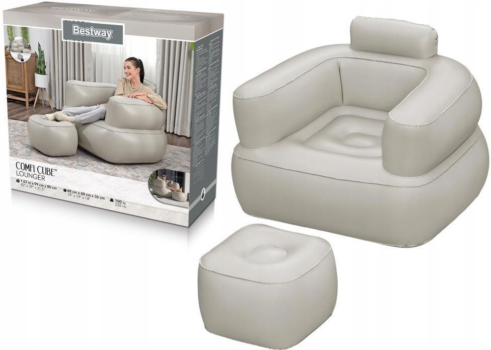 ND24_21864 Dmuchany Fotel Jasny Bestway 75137 590 ND24_21864 Dmuchany Fotel Jasny Bestway 75137 590 ND24_21864 Dmuchany Fotel Jasny Bestway 75137 5905991075554 Dmuchany Fotel Jasny Bestway 75137Dmuchany fotel Bestway to wygodne i stylowe siedzisko idealne do użytku w domu i na świeżym powietrzu. Dzięki ergonomicznej konstrukcji i flokowanej powierzchni zapewnia komfortowy wypoczynek, a solidne materiały gwarantują trwałość i wygodę. Został wykonany z wytrzymałego PVC, co zapewnia długotrwałe użytkowanie i komfort siedzenia. Dzięki składanej konstrukcji jest łatwy do przechowywania i transportu, co sprawia, że doskonale sprawdzi się w sypialni, salonie czy domowym barze. Nowoczesny design fotela umożliwia szybkie napompowanie przy minimalnym wysiłku. Kompaktowa forma pozwala na ustawienie go w dowolnym miejscu, co jest idealnym rozwiązaniem dla osób ceniących wygodę i elastyczność.Wymiary fotela :107 x 99 x 80 cm, ND24_21864 Dmuchany Fotel Jasny Bestway 75137 590 OKAZJA! Sprawdź inne nasze oferty!