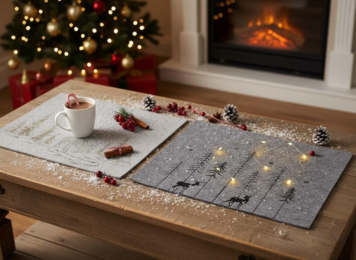 Mata Filcowa LAS 45×33 cm – Mix 2 Kolorów Świąteczna mata filcowa LAS to subtelny i stylowy element dekoracyjny, który doda ciepła i naturalnego uroku każdemu wnętrzu. Wykonana z filcu o wymiarach 45×33 cm, doskonale sprawdzi się jako mata pod talerze, kubki lub świąteczne dekoracje. Dostępna w miksie dwóch kolorów – jasnoszarym i ciemnoszarym – przedstawia delikatne, leśne motywy z jeleniami, drzewami i zimową chatką, które wprowadzają atmosferę spokoju i natury do świątecznego stołu. Mata jest lekka, przyjemna w dotyku i praktyczna w użytkowaniu – chroni powierzchnię stołu przed zarysowaniami i zabrudzeniami, a jednocześnie stanowi elegancką ozdobę. Idealna do wnętrz urządzonych w stylu skandynawskim, rustykalnym lub klasycznym. Cechy produktu: • Materiał: filc • Wymiary: 45 × 33 cm • Kolorystyka: mix 2 kolorów/wzorów (WYSYŁKA LOSOWA) • Wzór: motyw lasu z jeleniami i chatką • Cena dotyczy 1 sztuki Zdjęcie aranżacyjne ma charakter poglądowy. Prezentowana aranżacja może zawierać elementy dekoracyjne niewchodzące w skład zestawu. Szczegóły dotyczące zawartości znajdują się w opisie produktu.