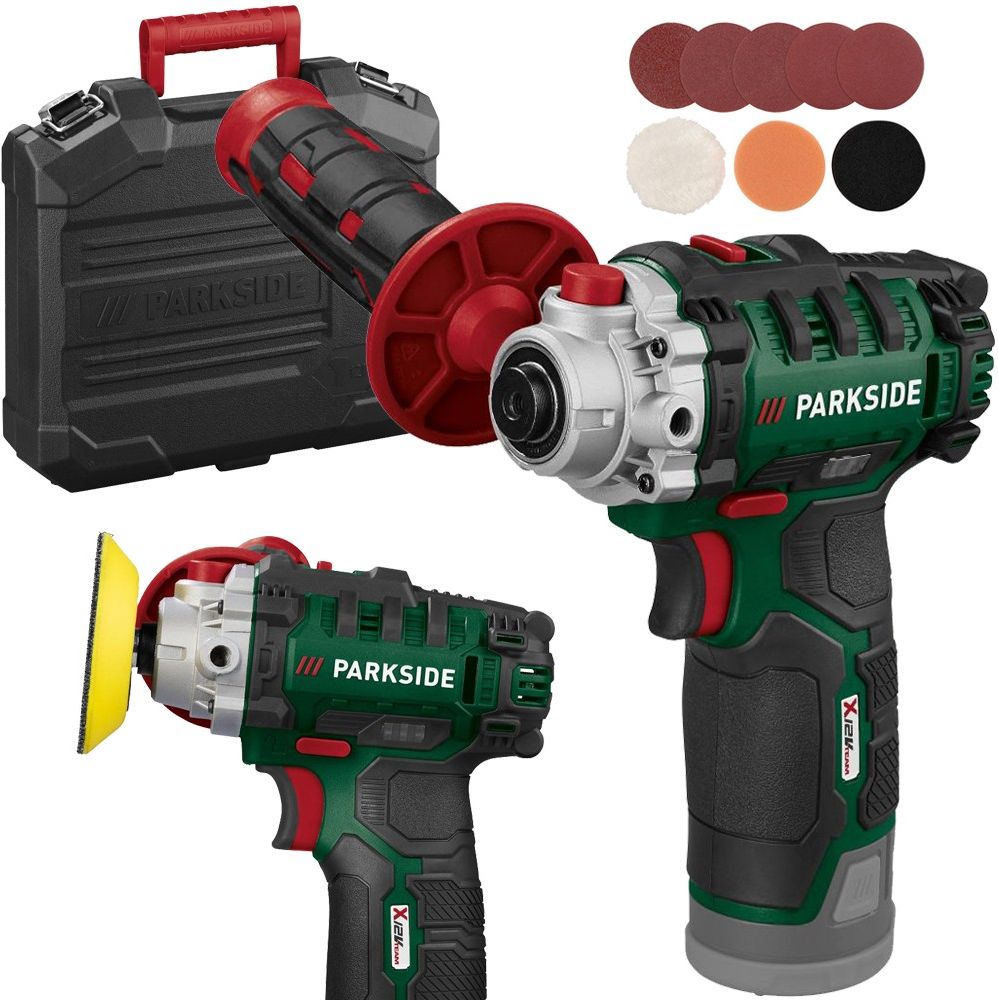 Polerka akumulatorowa Parkside PAAP 12 E5 12V 3 pady polerskie do wstępnego polerowania, obróbki końcowej i pielęgnacji Zestaw 5 papierów ściernych w trzech granulacjach (1 x 60 / 2 x 120 / 2 x 240) Instrukcja obsługi Walizka transportowa