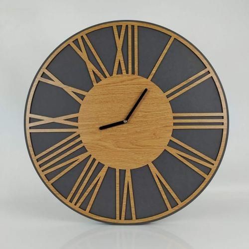 Zegar został wykonany z ekologicznej i bardzo twardej płyty typu MDF. wymiary tarczy: 50cm kolor: dąb naturalny i mdf barwiony mechanizm: płynący - BARDZO CICHY - brak efektu tykania w zestawie: Zegar + bateria AA Grubość zegara to 19 mm, mechanizm został umieszczony w wyfrezowanej kieszeni dzięki czemu idealnie dolega do ściany. Jesteśmy producentem, więc jeśli chciałbyś zegar w innym kolorze lub rozmiarze to chętnie podejmiemy się wykonania zegara według Waszych wskazówek.