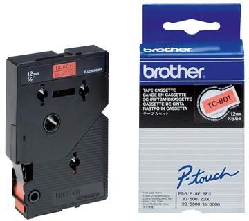 Brother TC-B01. Kolor etykiety: Czarny na pomarańczowym fluorescencyjnym, Typ taśmy: TC, Kolor produktu: Czarny. Szerokość taśmy: 1,2 cm, Długość taśmy: 7,7 m, Ilość na paczkę: 1 szt.