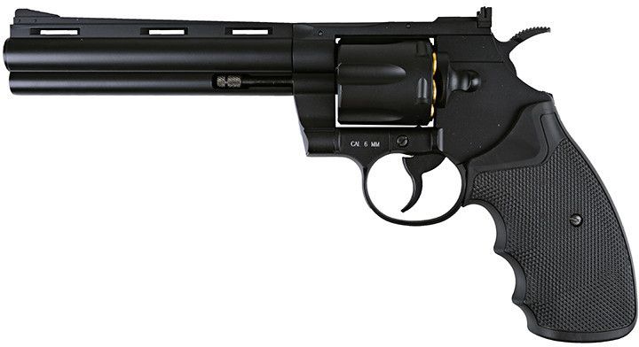 Rewolwer ASG GNB 6" .357 (KWC-02-008169) Wzorowany na: Magnum .357 Napęd repliki: CO2 12g Prędkość wylotowa: 500 fps Zasięg celnego strzału: Do 40 m Rodzaj magazynka: Bęben Pojemność magazynka: 6 kulek kalibru 6mm Gearbox: Nie dotyczy Korpus: Metal Długość całkowita: 280 mm Waga: 1120 g Blowback: …