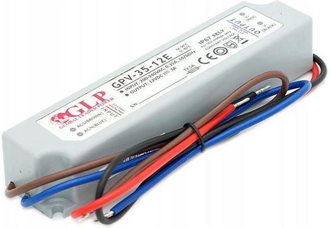 Profesjonalny wodoodporny zasilacz do LED o mocy znamionowej 35 Watt, na napięcie DC12V, marki GLP Power. Zasilacz LED model GPV-35-12, to zasilacz w hermetycznej obudowie IP67, który został wykonany z najwyższej jakości komponentów. Marka Global Leader Power, to renomowana jakości i trwałość na rynku urządzeń do zasilania oświetlenia LED. Model GLP GPV to niezawodny zasilacz hermetyczny w zamkniętej bezpiecznej obudowie do taśm LEDowych, zasila do żarówek LED, zasilacz do listw LEDowych oraz modułów LED na napięcie 12V. Parametry techniczne: moc znamionowa zasilacza: 35 Watt prąd znamionowy zasilacza: 3A maksymalna moc obciążeniowa zasilacza: do 28 Watt (patrz Uwagi) napięcie na wyjściu: 12V typ napięcia na wyjściu: DC - stałe, zasilanie na wejściu: 230V AC (w zakresie 90V÷264V) prąd AC na wejściu: 0.35A / 230V AC zakres częstotliwości napięcia: 47Hz÷63Hz tętnienia i szumy: 100mVp-p obudowa: hermetyczna ABS, chłodzenie: pasywne, klasa szczelności: IP67, klasa izolacji elektrycznej: II, zabezpieczenia: przeciążeniowe, zwarciowe, nadnapięciowe, zakres temperatury pracy: -30°C÷70°C, wymiary (dł. x szer. x wys.): 149mm x 32mm x 28mm. Uwaga: przy doborze mocy zasilacza należy uwzględnić obowiązkowy bezwzględny zapas mocy (Watt) wynoszący minimum 20%. mocy znamionowej zasilacza. (zasilacz o mocy znamionowej 100W, ma maksymalną moc obciążeniową 80W). Zachowanie zapasu powoduje prawidłową pracę zasilacza przez dłuższy czas bez zakłóceń, oraz w znacznym stopniu wydłuża trwałość zasilacza. Podłączenie zasilaczy, które nie posiadają gotowych wtyczek przyłączeniowych, do instalacji elektrycznej oraz oświetleniowej, powinien zostać wykonany przez osoby posiadające odpowiednie kwalifikacje G1 E. W naszej ofercie znajdziesz dodatkowe produkty do taśmy LED: taśmy LED: standard, premium i profesjonalne na 12V i 24V, zwykłe, wodoodporne i wodoszczelne, zasilacze LED: montażowe, meblowe, hermetyczne, gniazdkowe i na szynę DIN, profile i listwy do taśm LED: meblowe, podłogowe, architektoniczne, wpuszczane, nawierzchniowe, kątowe i okrągłe, sterowniki LED: RGB, RGBW, MONO, CCT na łączność IR, RF i WiFi oraz kontrolery SmartHome, włączniki LED: włączniki meblowe do profili, włączniki do szafek, włączniki podblatowe, czujki zbliżeniowe, czujki ruchu, przewody i złączki do taśm LED Dlaczego warto wybrać naszą ofertę: na rynku oświetleniowym od ponad 10 lat, sprawdzone produkty i sprawdzeni dostawcy, prawdziwe wartości i rzetelne parametry produktów (bez ściemy i bajek), najwyższe zadowolenie klientów (opinie Google), zaufanie renomowanych odbiorców, firma ze sklepami stacjonarnymi, nie twór typowo internetowy, doświadczenie i fachowe doradztwo, oferujemy własny serwis wraz z usługami dodatkowymi (nie tylko zwykła sprzedaż bez wsparcia),