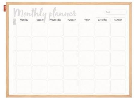 Tablica planer MemoBe Tablica z powierzchnią suchościeralno-magnetyczną z nadrukowanym terminarzem do planowania zadań miesięcznych. Właściwości suchościeralne pozwalają na pisanie po powierzchni tablicy markerami suchościeralnymi lub kredowymi. Natomiast właściwości magnetyczne dają możliwość umieszczania na tablicy rysunków, plakatów i ogłoszeń za pomocą magnesów. Powierzchnia tablicy wykonana jest z wysokiej jakości stali lakierowanej w kolorze białym. Trwały nieścieralny nadruk w językach polskim i angielskim wykonany jest w kolorze czarnym. Z tyłu tablicy zastosowano pilśnię, która pełni rolę usztywnienia. Rama wykonana jest z naturalnego drewna sosnowego o szer. 20 mm i grub. 16 mm. W zestawie dołączone są uszka i gwoździki montażowe, marker suchościeralny, magnesy, gąbka oraz instrukcja montażu. Montaż tablicy w układzie poziomym. Tablica polecana jest jako podstawowe wyposażenie dla wszystkich jednostek edukacyjnych, instytucji biurowych, a przede wszystkim do pokojów dziecięcych i młodzieżowych. Klasyczna i modernistyczna konstrukcja oraz kunsztowne wykończenie sprawiają, że tablica doskonale wkomponowuje się w wystrój każdej klasy szkolnej, biura i domu. Tablica jako nośnik informacji przejmie również rolę świetnego planisty i organizatora codziennych zajęć zarówno dla dzieci, młodzieży i dorosłych. Pozwala na uporządkowanie notatek, prezentację rysunków dziecka i innych ważnych informacji. Produkt przeznaczony jest do użytku wewnętrznego. Tablicę cechuje niezwykła trwałość i sztywność dzięki zastosowaniu wysokiej jakości materiałów, które zapewniają bezpieczeństwo podczas ich montażu i użytkowania. Dzięki wysokiej jakości powierzchni, prezentowane na tablicy treści są dobrze widoczne i czytelne. Szczególną zaletą jest bardzo dobra ścieralność markera bez pozostawiania smug i plam na powierzchni tablicy. Okres gwarancji na powierzchnię wynosi 10 lat. Czyszczenie tablicy - za pomocą miękkiej gąbki lub ściereczki. Do pisania po tablicy należy używać wyłącznie markerów przeznaczonych do tablic. Zaleca się systematyczne czyszczenie i konserwację powierzchni za pomocą dedykowanych płynów do tablic. Tablice suchościeralne magnetyczne MemoBe posiadają Certyfikat Zgodności, który potwierdza, że wyrób spełnia wymagania zawarte w normie PN-EN 14434:2010, tzn. jest bezpieczny podczas jego montażu i użytkowania. Produkt opatrzony jest znakiem B (Bezpieczeństwo).
