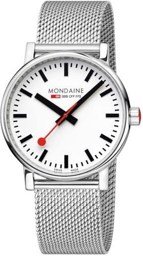Klasyczne szwajcarskie wzornictwo z nowoczesną elegancją – Mondaine evo2 łączy w sobie kultową tarczę szwajcarskiego zegara kolejowego ze stylową obudową ze stali nierdzewnej 40 mm w kolorze srebrnym dla ponadczasowego wyglądu Precyzyjny szwajcarski mechanizm kwarcowy Ronda – wysokiej jakości …