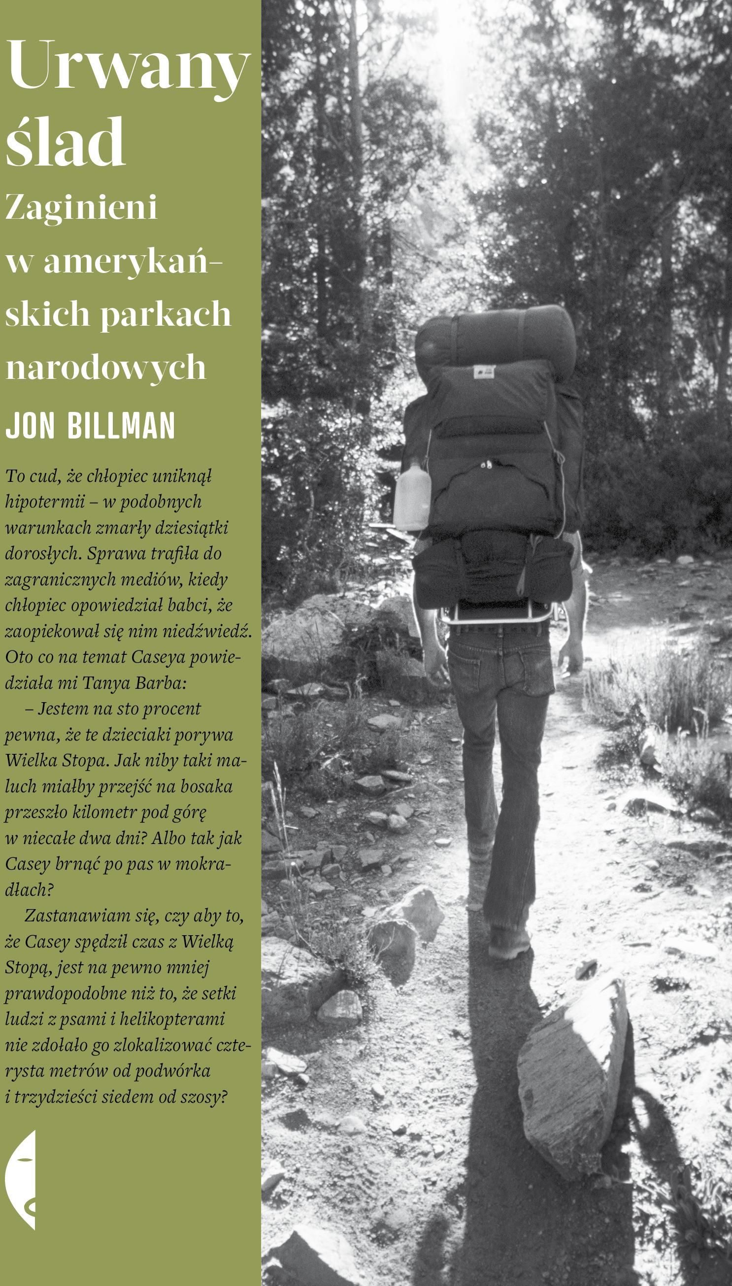 Parki narodowe w Stanach Zjednoczonych to miejsca o statusie niemal mitycznym – symbole wolności i obietnice przygody. Jednak mają też mroczniejszą stronę. Na początku kwietnia 2017 roku Jacob Gray zatrzymał rower przy jednej z dróg prowadzących przez gęste lasy Parku Narodowego Olympic w stanie Waszyngton – i zniknął. Jakby rozpłynął się we mgle. Żadnych świadków, żadnego tropu. Jego historia nie jest wyjątkiem: co roku w amerykańskiej głuszy giną setki, może tysiące ludzi. Ile dokładnie? Nikt nie wie. W poszukiwaniach pomagają helikoptery, psy tropiące i wolontariusze, ale równie często szczęśliwy traf. Mimo to wiele spraw nigdy nie znajduje rozwiązania. Wtedy pojawiają się teorie spiskowe: od porwania przez Wielką Stopę przez przejście do innego wymiaru do interwencji UFO. Jon Billman tygodniami przemierzał bezdroża razem z rodziną Jacoba Graya, przede wszystkim z jego ojcem – ekscentrycznym surferem z Santa Cruz, który nie potrafi przestać szukać syna. Z tej podróży powstała opowieść o nadziei i rozpaczy oraz o rodzicielstwie, które nigdy się nie poddaje. Urwany ślad – Zaginieni w amerykańskich parkach narodowych „Urwany ślad” to fascynująca publikacja, która odkrywa mroczną stronę amerykańskich parków narodowych. Jon Billman zabiera nas w podróż do miejsc, gdzie wolność i przygoda mogą skrywać niebezpieczeństwo, a zniknięcia ludzi pozostają niewyjaśnione. Dla kogo jest ta książka? Miłośnicy literatury faktu Osoby interesujące się zjawiskami paranormalnymi i teoriami spiskowymi Fani przygód i eksploracji dzikiej natury Osoby poszukujące inspiracji do własnych podróży Osoby zainteresowane tematyką zaginięć i kryminalistyki Co zyskasz dzięki tej publikacji? Wgląd w tajemnice zniknięć w amerykańskich parkach narodowych Możliwość poznania historii ludzi, którzy zniknęli bez śladu Refleksję nad mrocznymi aspektami natury i ludzkiej psychiki Inspirację do odkrywania nieznanych miejsc i historii Przyjemność z czytania wciągającej narracji o poszukiwaniach i tajemnicach Kluczowe tematy i obszary Zaginięcia w parkach narodowych Teorie spiskowe dotyczące zniknięć Poszukiwania osób zaginionych Relacje rodzinne i emocjonalne w obliczu tragedii Przygoda i niebezpieczeństwo w dzikiej naturze O Autorze Jon Billman to doświadczony dziennikarz i autor, który z pasją bada zjawiska związane z zaginięciami. Jego prace często łączą elementy reportażu i literatury faktu, co czyni je niezwykle wciągającymi i emocjonalnymi. O Wydawcy Wydawnictwo Czarne to renomowany polski wydawca, specjalizujący się w literaturze faktu oraz reportażu. Z pasją promuje autorów, którzy odkrywają nieznane historie i zjawiska, dostarczając czytelnikom wartościowych treści. Producent/osoba odpowiedzialna za bezpieczeństwo produktuWydawnictwo Czarne sp. z o. o.Wołowiec 1138-307 Sękowaredakcja@czarne.com.pl515 274 298