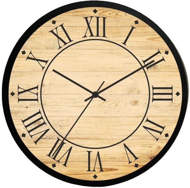 Klasyczny zegar ścienny retro. Czarna obudowa, brązowa stylizowana na drewno tarcza. Mechanizm kwarcowy. Średnica 30 cm