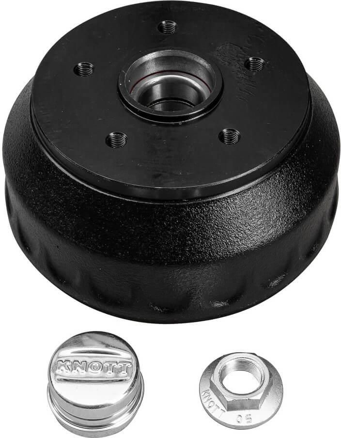 Oryginalny bęben hamulcowy z łożyskiem firmy Knott. W zestawie z łożyskiem kompaktowym o średnicy fi 39 mm, nakrętką łożyskową i osłoną piasty.