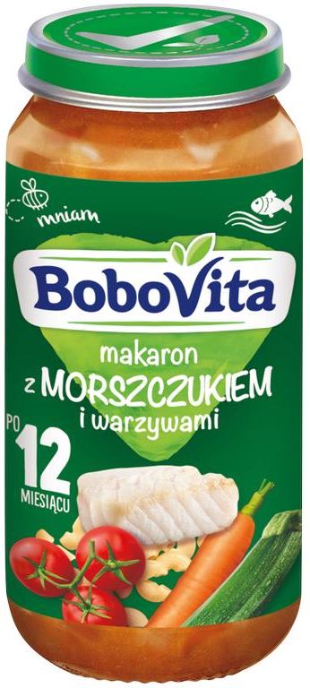BoboVita Makaron z morszczukiem i warzywami po 12 miesiącu 250g Opis produktu BoboVita Makaron z morszczukiem i warzywami po 12. miesiącu Produkt przeznaczony dla małych dzieci po 12 miesiącu życia. Skład oraz konsystencja odpowiednie do wieku dziecka, z dużymi kawałkami do gryzienia. Jakość potwierdzona na 100%. 100% warzyw z kontrolowanych upraw zgodnie z przepisami prawa żywność dla niemowląt i małych dzieci nie zawiera konserwantów, barwników i wzmacniaczy smaku nie zawiera: soi, mleka kwas ALA (z grupy Omega 3) niezbędny dla prawidłowego rozwoju mózgu i tkanek nerwowych (korzystne działanie uzyskuje się już przy spożyciu 70 g produktu) Dla zdrowia dziecka ważna jest urozmaicona i zbilansowana dieta oraz zdrowy tryb życia. Zalecenia dla alergików: Jaja - Zawiera Ryba - Zawiera Mleko - Nie zawiera Gorczyca - Może zawierać Soja - Nie zawiera Pszenica - Zawiera Dodatki: Barwniki - Nie zawiera Wzmacniacze smaku - Nie zawiera Konserwanty - Nie zawiera Przygotowanie: Odpowiednią ilość produktu przełóż do miseczki plastikową łyżeczką. Podgrzej w „kąpieli wodnej", delikatnie wymieszaj. Sprawdź temperaturę produktu. Przestrzegaj instrukcji właściwego przygotowania. Nie podawaj resztek produktu, który jadło dziecko. Przechowywanie: Najlepiej spożyć przed: patrz data na wieczku. Przed otwarciem przechowuj w temperaturze pokojowej. Nie używaj, jeśli można wcisnąć środek wieczka. Pozostałą część przechowuj w zamkniętym słoiczku w lodówce, nie dłużej niż 48 godzin. Składniki: warzywa 57 % (odtworzony przecier pomidorowy 24 %, cukinia 23 %, marchewka 7 %, cebula), woda użyta do przygotowania, gotowany makaron 14 % (mąka z pszenicy durum, białko jaja kurzego), ryba morszczuk 9 %, skrobia kukurydziana, olej rzepakowy, oregano. Produkt może zawierać gorczycę.