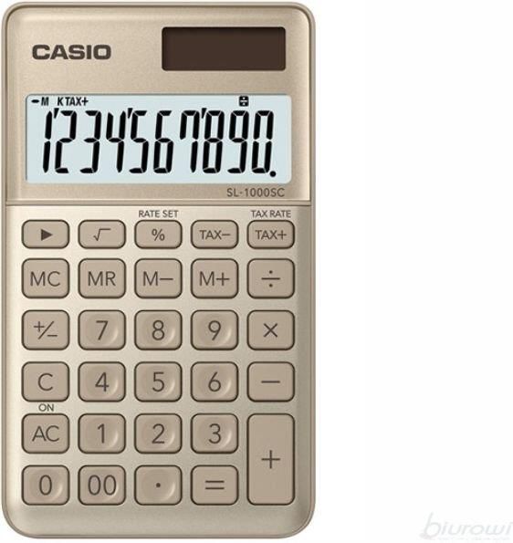 Kalkulator biurowy Casio SL-1000SC-GD-S. Klasyczny, podstawowy kalkulator do zastosowań biurowych. Wyświetlacz 10 cyfr Kolor: złoty Wymiary: 120 x 71 x 8.7 mm Podwójne zasilanie: bateria lub ogniwo solarne Automatyczne wyłączanie Funkcje: Pierwiastek kwadratowy Przycisk procenty % Podwójne zero 00 Klawisz cofania Zmiana znaku +/- Obliczenia podatkowe Wyznaczenie ilości miejsc po przecinku Pamięć