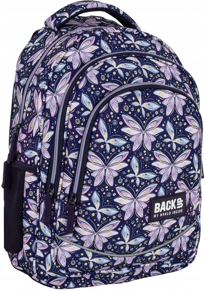 Plecak szkolny BackUP Wróżki dla dziewczynki motyle X04 Ten plecak to spełnienie marzeń każdej małej czarodziejki! Niezwykle dziewczęcy, pełen fantazji i subtelnego blasku – plecak z kolekcji Wróżki przenosi do świata baśni, gdzie wszystko jest możliwe. Granatowe tło przypomina nocne niebo, na którym wirują fioletowo-różowe wróżki, ozdobione złotymi akcentami, niczym pyłek magii unoszący się w powietrzu. Stylowy i magiczny design Kobiecy, ale nie przesłodzony – łączy elegancję z dziecięcą wyobraźnią. To doskonały wybór dla uczennicy, która lubi wyróżniać się subtelnym urokiem i dba o każdy szczegół swojej szkolnej stylizacji. Idealny towarzysz szkolnych przygód Plecak BackUP Wróżki został stworzony z myślą o funkcjonalności i wygodzie. Dzięki przemyślanej konstrukcji pomieści wszystkie niezbędne przedmioty, a przy tym dba o komfort użytkowania – nawet przez cały intensywny dzień w szkole. Szczegóły, które robią różnicę 3 pojemne komory – doskonałe do organizacji podręczników, zeszytów, piórnika i innych szkolnych skarbów 2 boczne kieszenie – idealne na bidon lub butelkę z wodą Kieszenie na laptop i tablet w głównej komorze – bezpieczeństwo dla nowoczesnych narzędzi edukacji Organizer w przedniej komorze – z siateczkową kieszenią na zamek, uchwytem na klucze, miejscem na długopisy, legitymację i większą kieszenią na drobne artykuły higieniczne Ergonomiczne, usztywnione plecy z oddychającą pianką – komfort i zdrowe wsparcie dla kręgosłupa Miękkie, profilowane szelki z regulacją – idealne dopasowanie do sylwetki dziecka Czarne dno ze wzmocnionej tkaniny – trwałość i odporność na zabrudzenia Wytrzymała rączka i uchwyt do powieszenia – praktyczność w każdej sytuacji Odblaski na froncie i szelkach – dla bezpieczeństwa po zmroku Specyfikacja techniczna Wymiary: 42 x 30 x 20 cm – idealne dla starszych uczniów szkoły podstawowej, licealistów oraz na wyjazdy. Waga: 650 g – lekki i wygodny do noszenia przez cały dzień. Kolekcja: Wróżki.