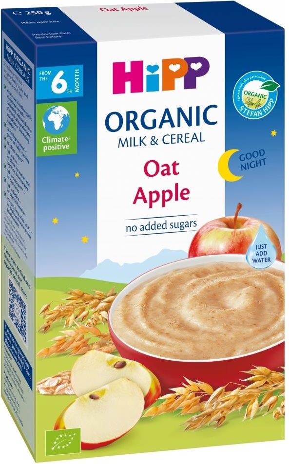 HiPP BIO Kaszka mleczno-zbożowa na dobranoc owsianka z jabłkami od 6. miesiąca 250g Kaszka mleczno-zbożowa Na Dobranoc Owsianka z jabłkami HiPP BIO dla niemowląt od 6. miesiąca, 250g bez dodatku cukru - zawiera naturalnie występujące cukry do przygotowania z wodą Ekologiczna kaszka HiPP Na Dobranoc Owsianka z jabłkami to pełnowartościowy posiłek mleczno-zbożowy, idealny do podania przed snem. Zawiera składniki BIO najwyższej jakości, w tym pełnoziarniste zboża zapewniające uczucie sytości. Dla bezpiecznego i zdrowego żywienia Twojego dziecka: - bez dodatku cukru - zawiera naturalnie występujące cukry- ekologiczne, wartościowe zboża- surowo kontrolowane- delikatne dla małych brzuszków- Wysoka zawartość żelaza, które pomaga w prawidłowej produkcji czerwonych krwinek i hemoglobiny oraz przyczynia się do prawidłowego rozwoju funkcji poznawczych- Wysoka zawartość wapnia**, potrzebnego dla prawidłowego rozwoju kości- Wysoka zawartość jodu, ważnego dla prawidłowego funkcjonowania tarczycy **zgodnie z przepisami prawa Składniki serwatka z mleka* pełnoziarnista mąka owsiana* 14 % pełnoziarnista mąka pszenna* 13 % odtłuszczone mleko w proszku* 13 % przecier jabłkowy* 13 % oleje roślinne* (olej słonecznikowy*, olej rzepakowy*) kasza manna (z pszenicy)* wyciąg z jabłek węglan wapnia witamina C difosforan żelaza (III) witamina E witamina B₁ witamina A jodan potasu witamina D *z rolnictwa ekologicznego Ważne informacje- Dla zdrowia Twojego dziecka ważne jest przestrzeganie sposobu przygotowania kaszki. - Zawsze podawaj kaszkę łyżeczką i przygotowuj ją bezpośrednio przed karmieniem.- Po każdym użyciu starannie zamknij torebkę. Przechowuj ją w higienicznych warunkach, w suchym miejscu, w temperaturze pokojowej. Zawartość opakowania zużyj w ciągu 3-4 tygodni po otwarciu.- Nie podgrzewaj kaszki w kuchence mikrofalowej (niebezpieczeństwo poparzenia!).- W celu ochrony ząbków dziecka przed próchnicą nie podawaj kaszki po wieczornej pielęgnacji jamy ustnej.