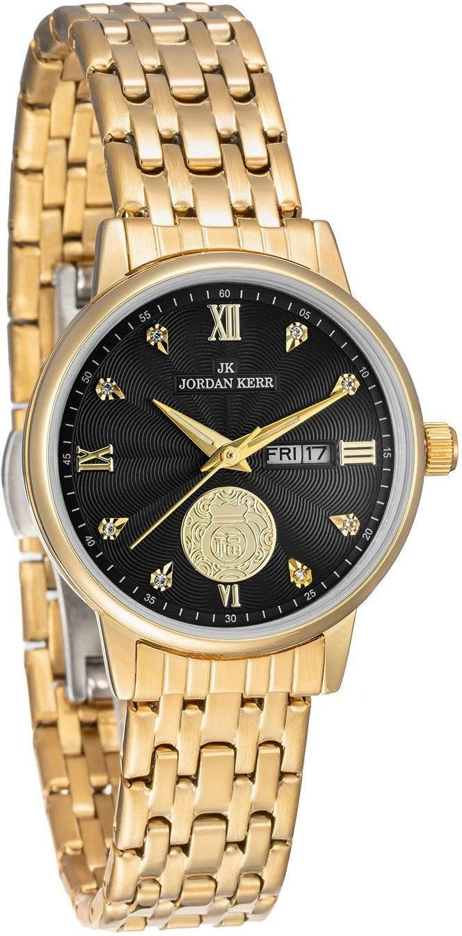 Damski klasyczny elegancki zdobiony złoty okrągły zegarek Jordan Kerr L1071 IPG CT - złota koperta i bransoleta, czarna tarcza ze złotymi akcentami zdobiona kryształkami, datownik, klasa szczelności 30M. Japoński mechanizm kwarcowy