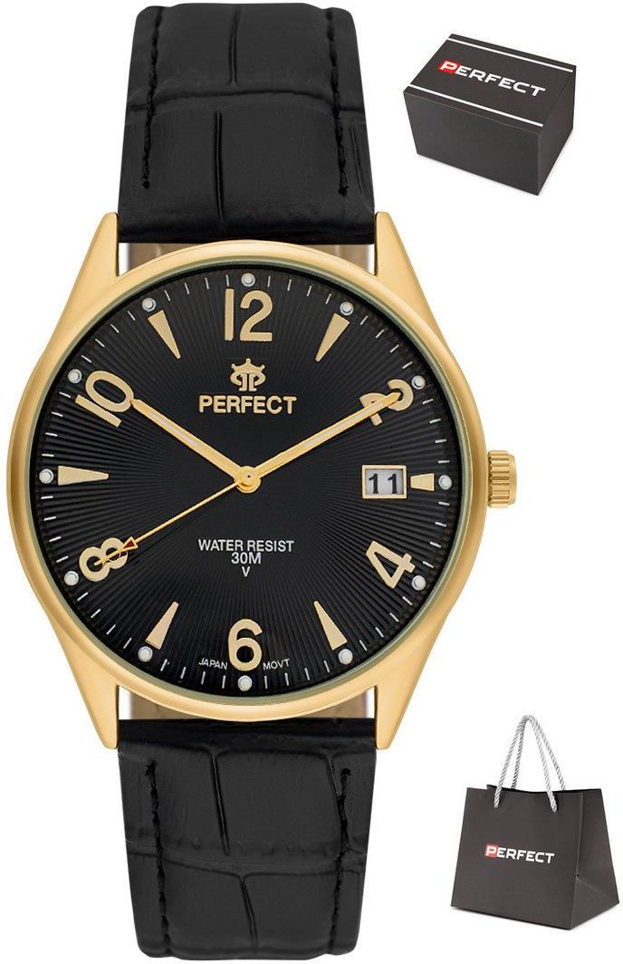 Męski klasyczny okrągły czytelny zegarek Perfect C141T-05 - metalowa koperta w kolorze złotym, czarny skórzany przeszywany pasek, czarna tarcza, złote cyfry i wskazówki, klasa szczelności 30M, datownik. Japoński mechanizm kwarcowy