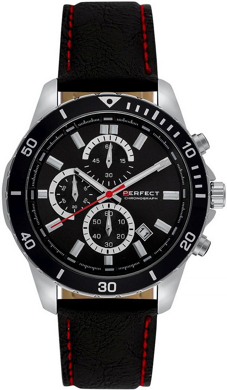 Męski klasyczny sportowy okrągły czytelny zegarek Perfect Adventure Chronograf W502CH-02 - srebrna metalowa koperta, czarny skórzany pasek, czarna tarcza, kontrastowe wskazówki, klasa szczelności 30M, stoper, datownik. Japoński mechanizm kwarcowy