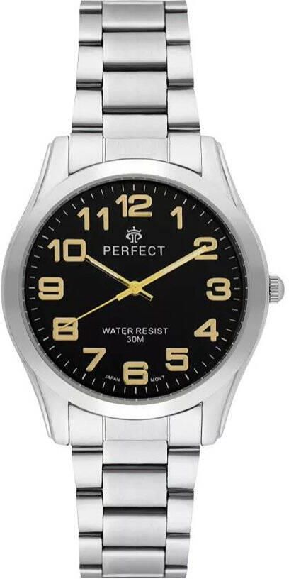 Męski klasyczny okrągły czytelny zegarek Perfect R403P-04 - metalowa koperta i stalowa bransoleta w kolorze srebrnym, czarna tarcza czasomierza, kontrastowe cyfry i wskazówki, klasa szczelności 30M. Japoński mechanizm kwarcowy