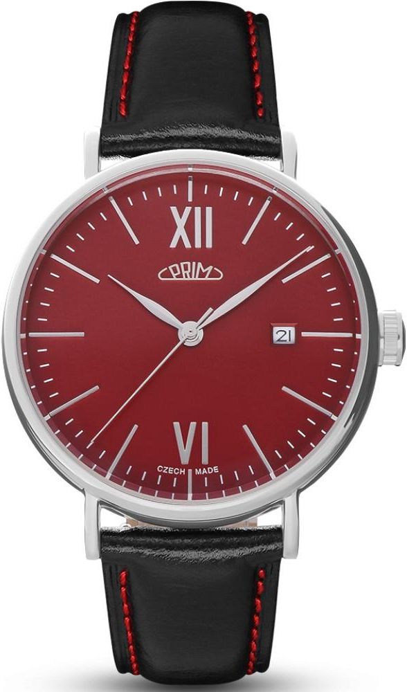Męski automatyczny klasyczny stalowy wodoszczelny zegarek PRIM Retro Elegance W01P.13196.F - stalowa koperta, skórzany pasek, czerwona tarcza czasomierza, datownik, klasa szczelności 50M, szafirowe szkło. Japoński mechanizm automatyczny