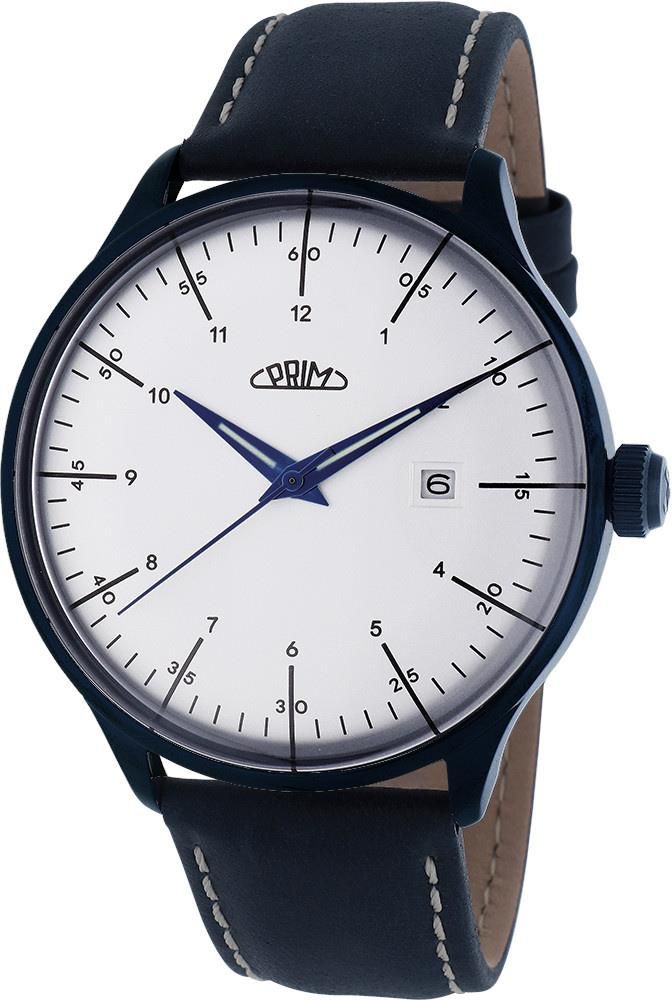 Męski automatyczny klasyczny stalowy wodoszczelny zegarek PRIM Retro Automatic W01C.13149.D - niebieska stalowa koperta, skórzany pasek, jasna tarcza czasomierza, datownik, klasa szczelności 50M, mineralne szkło. Japoński mechanizm automatyczny