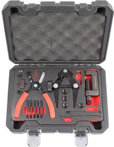 Zestaw do obsługi łańcuchów motocyklowych 21elZestaw narzędzi do kompleksowej obsługi łańcucha motocyklowego w skład którego wchodzą m.in.: - przyrząd do zakuwania i rozkuwania łańcucha (trzpienie: 2.2/2.9/3.8/4.8), - szczypce do usuwania spinek ogniw łańcucha, - przyrząd do ogniw łańcucha.