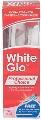 White Glo Professional Choice profesjonalna wybielająca pasta do zębów, bezpieczna i efektywna w użyciu dla zębów naturalnych, plombowanych i wybielanych. Formuła opracowana z myślą o aktorach i modelkach. Opakowanie 100ml./150g. wraz z szczoteczką oraz wykałaczkami dentystycznymi. WGP07 …