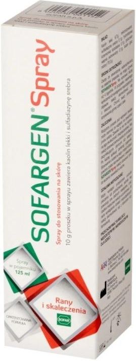 Sofargen spray 125 ml to wyrób medyczny w postaci proszku w sprayu na rany i oparzenia, przeznaczony do miejscowego stosowania na uszkodzoną skórę. Zawiera sulfadiazynę srebra, która wykazuje działanie bakteriobójcze i ogranicza ryzyko rozwoju infekcji. W składzie występuje także kaolin lekki, czyli naturalna glinka o właściwościach absorbujących wysięk i tworzących ochronną barierę przed czynnikami zewnętrznymi. Dzięki takiemu połączeniu, Sofargen spray na oparzenia wspiera naturalne procesy gojenia. Ten spray na rany może być stosowany w przypadku drobnych otarć, skaleczeń, zadrapań, a także przy oparzeniach i powierzchniowych urazach skóry. Preparat charakteryzuje się łatwą aplikacją, dobrze przylega do miejsca podania i może być w prosty sposób usunięty poprzez przepłukanie rany roztworem soli fizjologicznej. Sofargen spray 125 ml należy przechowywać poza zasięgiem małych dzieci.