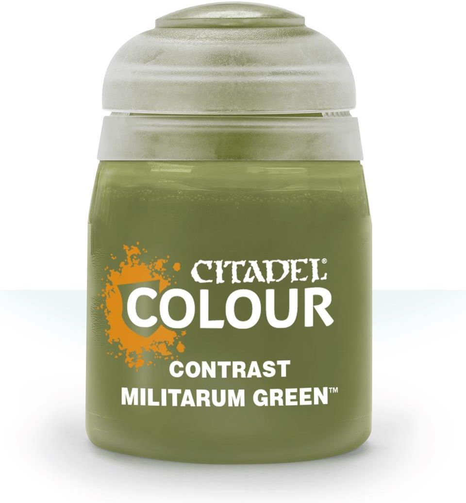 Farbka CONTRAST: MILITARUM GREEN. Najnowsze rozwiązanie od Games Workshop mające ułatwić wejście do malowania dla początkujących i pomóc w rozwiązaniu problemu szarych armii. Pozwala na szybkie malowanie z efektem Tabletop, czyli nie jest to mistrzostwo malarstwa, ale będzie ładnie wyglądało na stole. Użycie technik takich jak drybrushing czy highlight daje już naprawdę ciekawe figurki. Sam używam i jestem zadowolony z efektów.