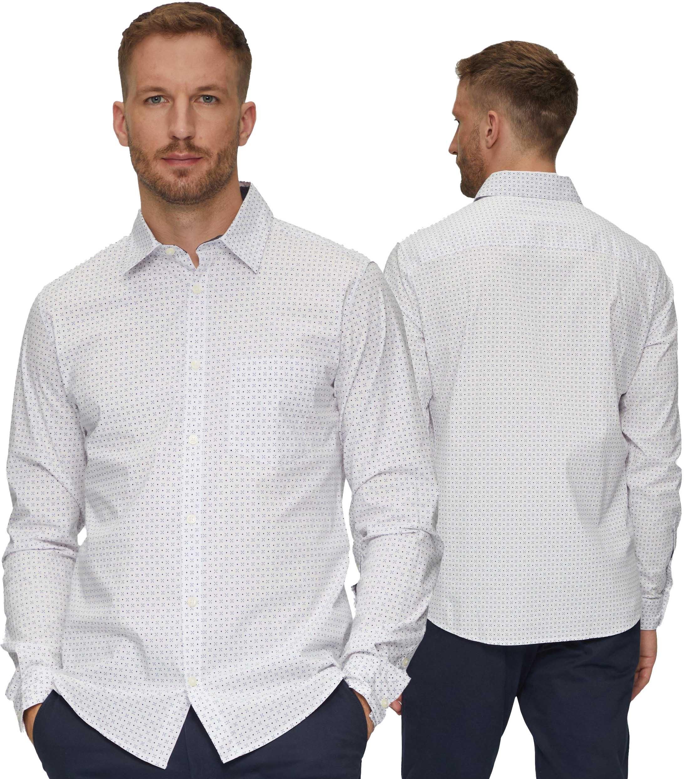 Koszula męska s.Oliver SlimFit biała wzory - MInformacje o produkcie: Koszula męska s.Oliver kolor: biały wzór na całej powierzchni zapięcie na guziki zaokrąglony dół kieszeń na piersi Dopasowanie: Slim Fit Materiał: 97% bawełna 3% elastan