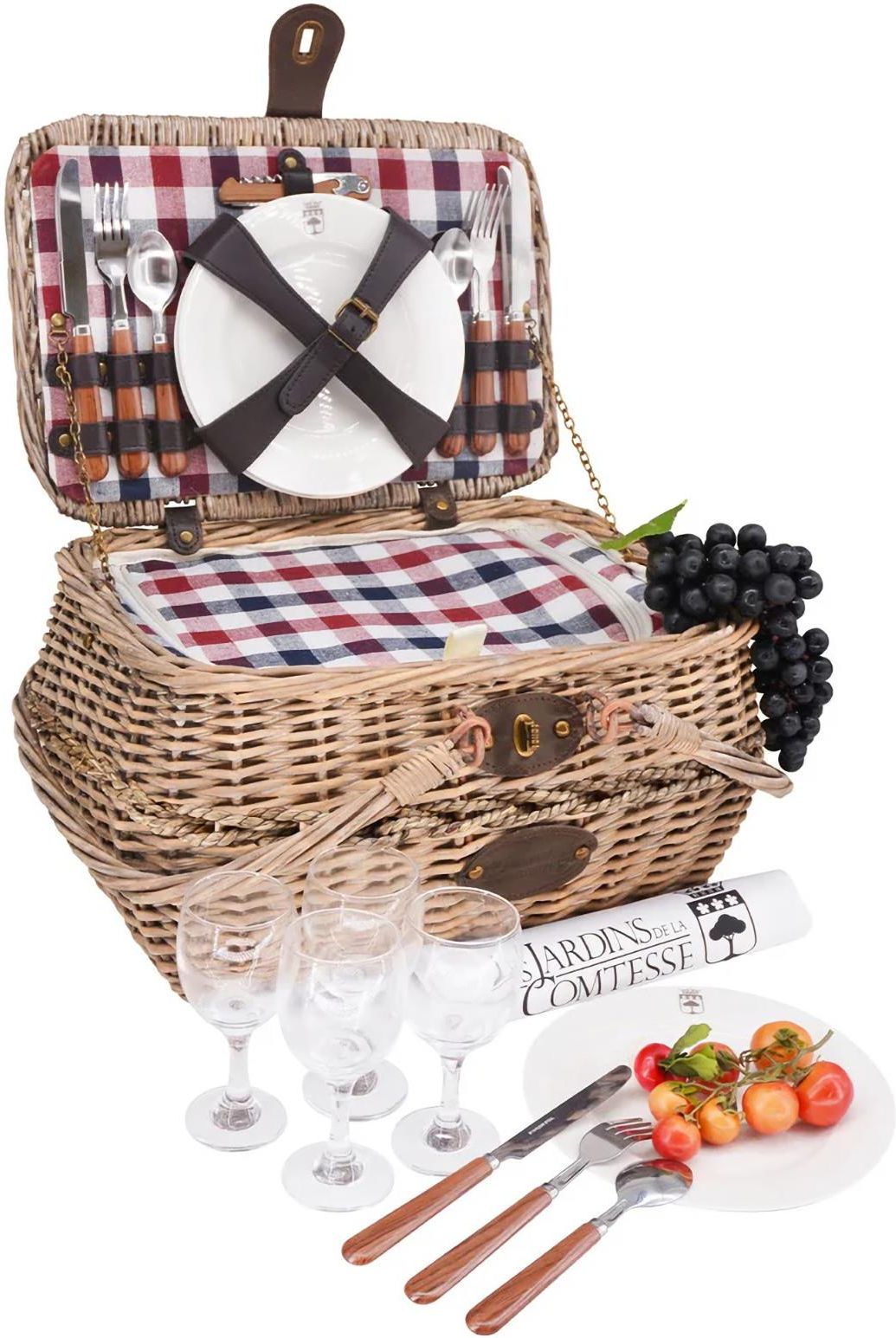Kosz piknikowy Sarlat dla 4 osób. Wykonany ręcznie z wikliny. Wyposażony w komplet naczyń i akcesoria dodatkowe, które można myć w zmywarce. Posiada komorę izotermiczną.