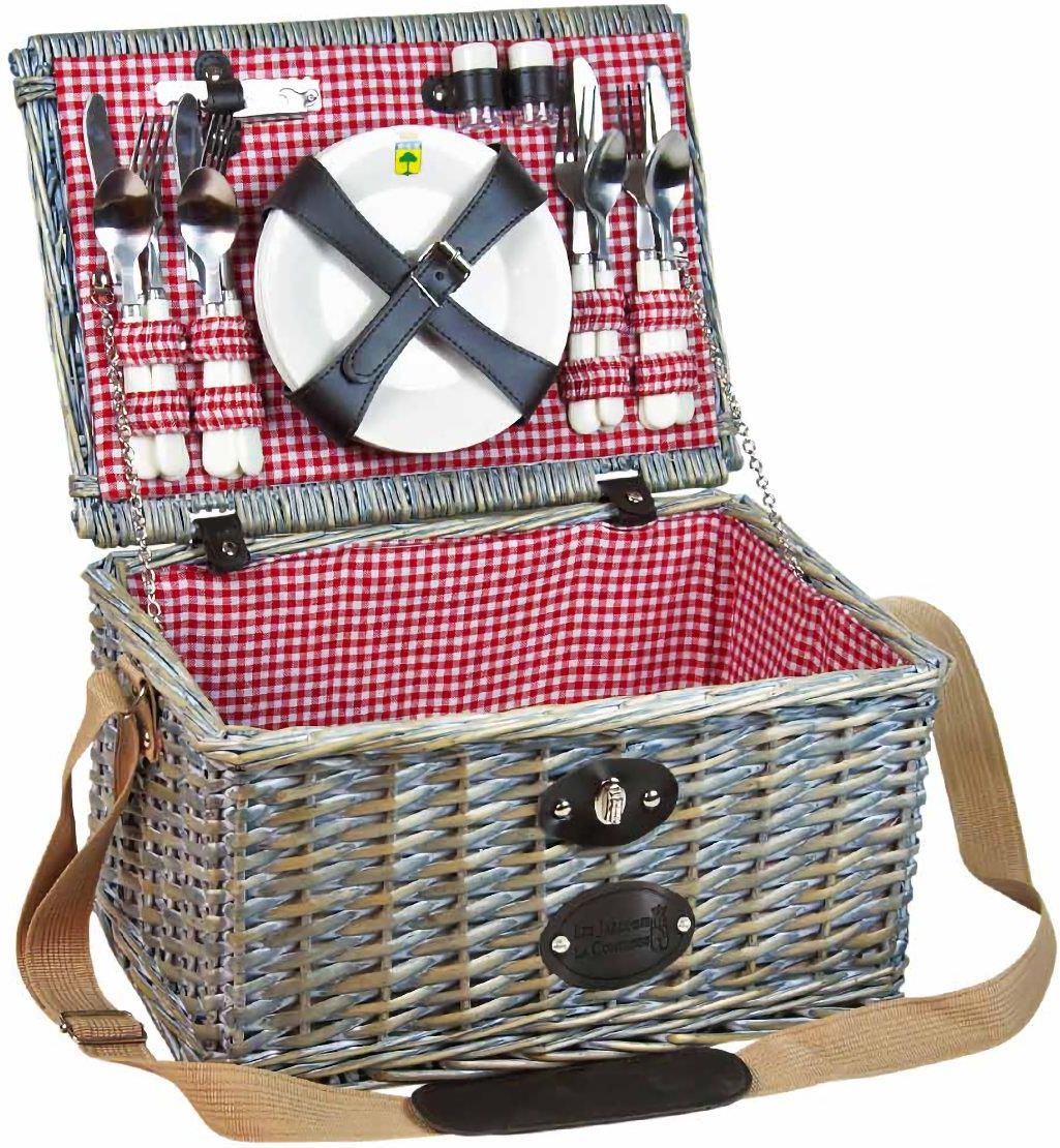 Tradycyjnie wyglądający kosz piknikowy z wyposażeniem dla 4 osób Sully. Wykonany z patynowanej na szaro wikliny, imitacji skóry i tkaniny w czerwono-białą kratkę.