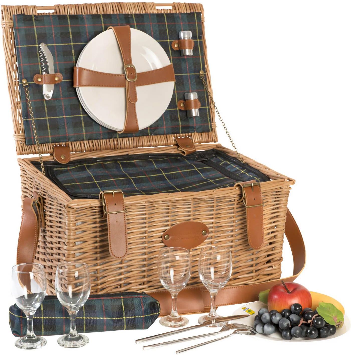Kosz piknikowy Trianon Scottish Green z wyposażeniem dla 4 osób. Wykonany ręcznie ze skory, wikliny i tkaniny w szkocką kratę. Unikalny i praktyczny.