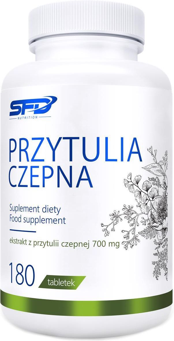 SFD Przytulia Czepna 180 tabletek SFD Przytulia Czepna to suplement diety dla osób dorosłych w formie kapsułek. Produkt zawiera ekstrakt z przytulii czepnej. Składniki Ekstrakt z przytulii czepnej Galium aparine, substancja wypełniająca: celuloza mikrokrystaliczna, skrobia, substancje przeciwzbrylające: dwutlenek krzemu, sole magnezowe kwasów tłuszczowych. Może zawierać zboża zawierające gluten, soje, mleko, jaja i produkty pochodne. Jedna tabletka zawiera 700 mg ekstraktu z przytulii czepnej. Zalecane dzienne spożycie Dorośli: 1 tabletka dziennie, najlepiej po posiłku, popijając wodą. Stosować przez okres 2-3 miesięcy, po czym zrobić miesięczną przerwę. Ostrzeżenia dotyczące bezpieczeństwa Nie należy przekraczać zalecanej dziennej porcji. Suplement diety nie może być stosowany jako substytut (zamiennik) zróżnicowanej diety. Suplement diety jest środkiem spożywczym, którego celem jest uzupełnienie normalnej diety. Dla utrzymania prawidłowego stanu zdrowia należy stosować zróżnicowaną dietę i prowadzić zdrowy tryb życia. Przechowywać w temperaturze pokojowej. Przechowywać w sposób niedostępny dla małych dzieci. Osoby przyjmujące leki powinny omówić suplementację ze specjalistą. Nie spożywać w przypadku uczulenia (nadwrażliwości) na którykolwiek składnik produktu. Nie stosować u dzieci, kobiet w ciąży i w trakcie laktacji. Nie przekraczać 1 porcji dziennie (1 tabletka). Produkt przeznaczony dla osób powyżej 18 roku życia. Po użyciu opakowanie należy zawsze zamykać.