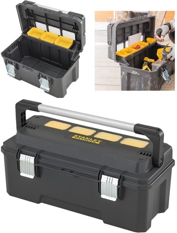 skrzynia narzędziowa 26", PRO CANTILEVER FATMAX, firmy Stanley [FMST1-75791]: nowoczesna skrzynia z długą, aluminiową rączką wygodną do transportu serii PRO CANTILEVER w rozmiarze 26", zastosowano w niej konstrukcję ruchomej tacy z wyjmowanymi pojemnikami w różnych rozmiarach i dużą przestrzenią na narzędzia ręczne i akcesoria, przeźroczyste okienka w pokrywie dają pełną widoczność zawartości pojemników bez otwierania pokrywy, posiada 4 duże i 2 małe wyjmowane pojemniki na drobne elementy oraz specjalne miejsce na kocówki, po zamknięciu pokrywy skrzyni pojemniki z akcesoriami zostają zabezpieczone przed przesypywaniem się między sobą, wyposażona w duże nierdzewne klamry zamykające, uszczelki w pokrywie sprawiają że skrzynia jest pyłoszczelna oraz wodoodporna (zgodne z klasą odporności IP54), skrzynię można zamknąć na kłódkę (nie ma kłódki na wyposażeniu), PARAMETRY SKRZYNI [FMST1-75791]: rozmiar skrzyni: 26" wymiary: 610 mm x 248 mm x 245 mm Narzędzia i akcesoria pokazane na zdjęciach nie są na wyposażeniu skrzyni.