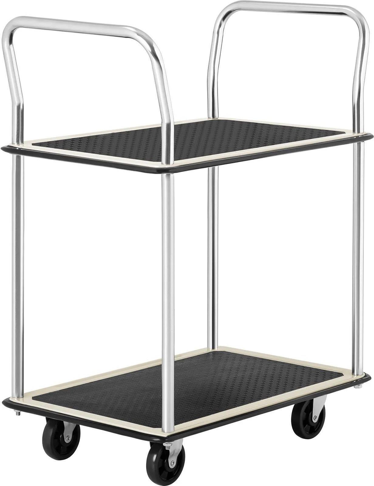 Wózek półkowy transportowy z uchwytami 2 półki do 120 kg 72 x 43 cm MSW Kod producenta: 10061352 Wózek półkowy marki MSW sprawdzi się w hotelach, sklepach, magazynach, hurtowniach do przewożenia ciężkich przedmiotów o różnej wielkości. Konstrukcja wózka wykonana została ze stali, jej nośność wynosi 120 kg. Dwie półki z antypoślizgowymi matami o wymiarach 72 x 43 cm będą odpowiednie także do dłuższych ładunków. Po obu stronach wózka znajdują się ręczne uchwyty wykonane ze stali. Cztery gumowe kółka o średnicy 10 cm (w tym dwa skrętne) umożliwiają bezproblemowe manewrowanie wózkiem. Wózek jest łatwy w konserwacji i czyszczeniu. Cechy produktu: - Duży udźwig do 120 kg, - Platforma o wymiarach 72 x 43 cm z antypoślizgową matą, - Szybki montaż, - Wytrzymała konstrukcja ze stali i gumy, - 4 kółka w tym 2 skrętne dla łatwego manewrowania wózkiem. Parametry techniczne: - Model - MSW-PW-120 - Nr katalogowy - 10061352 - Stan artykułu - Nowy - Materiał - Stal - Materiał kółek - Guma - Maks. udźwig - 120 kg - Wymiary (DxSxW) - 75,00 x 47,00 x 95,00 cm - Waga - 13,55 kg - Wymiary wysyłki (DxSxW) - 79,00 x 52,00 x 15,00 cm - Waga wysyłki - 14,85 kg W zestawie: - Wózek półkowy - Instrukcja obsługi Kod producenta: 1014975