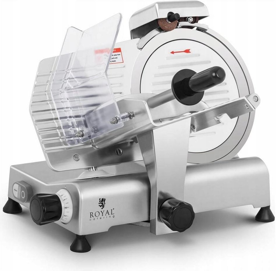 Krajalnica - 250 mm - do 8 mm - wbudowana ostrzałka marki Royal Catering Model: RCAM-250E Nr katalogowy: 10011406 Stan produktu: Nowy Najważniejsze cechy produktu Wydajność – ostrze osiągające prędkość 480 obr./min dzięki silnikowi o mocy 150 W Regulacja – możliwość bezstopniowego ustawienia grubości cięcia w zakresie 0-8 mm Uniwersalność – duże 250-milimetrowe ostrze idealnie nadaje się do wszystkich rodzajów wędlin i serów Praktyczność – urządzenie wyposażono w półautomatyczną ostrzałkę Stabilność – ryflowana powierzchnia pomaga utrzymać produkt w miejscu i zapobiega ześlizgiwaniu się Specyfikacja techniczna Materiał - Stal węglowa Kolor - Srebrny Moc [W] - 150 Jednostka ostrząca - Zintegrowana i półautomatyczna Prędkość obrotowa ostrza [obr./min] - 480 Średnica ostrza [mm] - Instrukcja obsługi - Tak Wysokość paczki [cm] - 41 Długość paczki [cm] - 53 Szerokość paczki [cm] - 48 Waga paczki [kg] - 17.2 Wysokość produktu [cm] - 38 Długość produktu [cm] - 49 Szerokość produktu [cm] - 40.5 Waga produktu [kg] - 15.15 Liczba paczek - 1 Przemysłowa krajalnica do wędlin Royal Catering Profesjonalna krajalnica marki Royal Catering to doskonały element wyposażenia restauracji, firm cateringowych, a także sklepów spożywczych i masarskich. Z modelem RCAM-250E pokroisz wędliny bez kości oraz kiełbasy oraz sery na równe plasterki idealnie nadające się do kanapek i nie tylko. Maszynka do cięcia wędlin i sera RCAM-250E – opis Zapewnij swoim gościom i klientom idealnie równe oraz cienkie plasterki szynki, kiełbasy czy sera dzięki krajalnicy Royal Catering. Model RCAM-250E za sprawą swojej wydajności znajdzie zastosowanie w niejednym lokalu gastronomicznym. Przekonaj się sam i złóż zamówienie już dziś! Wydajne cięcie zapewniono przez dużą prędkość ostrza. Wynosi ona 480 obr./min, co wpływa na szybkie i bezpieczne porcjowanie produktów. Urządzenie wyposażono w silnik o mocy 150 W, który gwarantuje efektywną pracę. Bezstopniowa regulacja grubości krojenia jest możliwa za sprawą plastikowego pokrętła z numeracją. Dzięki niemu ustawisz odległość platformy od noża w zakresie od 0 do 8 mm. Ponadto krajalnicę przystosowano do obróbki dużych produktów o maksymalnej szerokości 17,5 cm i wysokości 14 cm. Duży okrągły nóż o średnicy 250 mm doskonale nadaje się zarówno do wędlin, jak i serów. Jeszcze wydajniejsze krojenie nabiału osiągniesz, wybierając teflonowe ostrze o numerze 10010271. Zintegrowana, półautomatyczna ostrzałka, która przez cały czas ostrzy obie strony tarczy tnącej, dba o to, aby praca z modelem RCAM-250E zawsze przebiegała szybko. Łatwa obsługa urządzenia wynika z szeregu rozwiązań zastosowanych w jego konstrukcji jak np. ryflowana powierzchnia platformy do krojenia zapobiegająca zsuwaniu się produktu podczas obróbki. Ponadto zamontowano ją pod kątem, co ułatwia dociskanie wędliny do ostrza bez przeciążania mięśni ramion i pleców. Z kolei plastikowe uchwyty wpływają na wygodne przesuwanie prowadnicy. Zawartość przesyłki Krajalnica Instrukcja obsługi Zdjęcia produktu