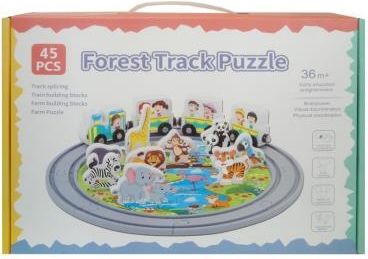 Zestaw składający się z 45 elementów, w tym torów, pociągu z wagonikami oraz klocków przedstawiających zwierzęta i postacie. Zabawka rozwija zdolności manualne, koordynację ruchową i wyobraźnię. Produkt zapakowany w kartonowe pudełko. Podane wymiary są wymiarami opakowania. Zabawka przeznaczona dla dzieci od 3 lat.