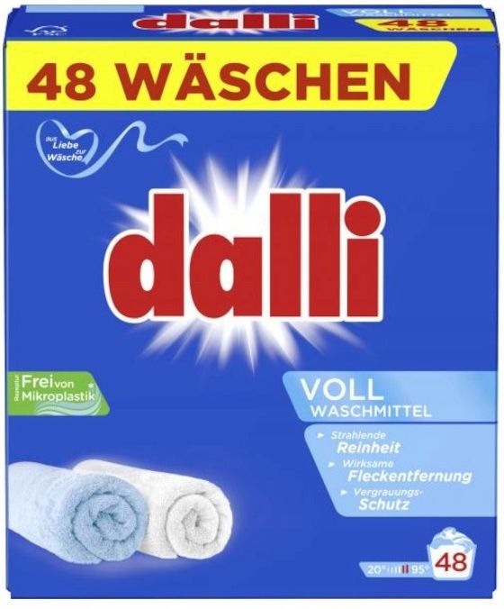 Proszek do prania DALLI Activ 48 prań 3,12kg Cechy produktu Wystarcza na minimum 48 prań ✅ Zapewnia długotrwałą świeżość ✅ Przyjemny, świeży zapach ✅ Działa nawet w niskich temperaturach ✅ Proszek do prania Dalli to doskonały środek, który pozbywa się plam niezależnie od temperatury. Substancje czynne zawarte w produkcie pozostają aktywne już od 20°C. Środek świetnie radzi sobie z różnego rodzaju zabrudzeniami i pozostawia świeży miły zapach, który utrzymuje się naprawdę długo ⭐ Proszek nie tylko zapewnia długą żywotność kolorów, ale też nie niszczy delikatnych tkanin. Dodatkowe informacje Masa netto: 3,12 kg ✅ Wydajność: prań Producent: DALLI ✅ Zastosowanie: do białego Kraj pochodzenia: Niemcy ✅ Ekonomiczne opakowanie 3,12 kg wystarczy na minimum 48 prań! Sposób użytkowania produktu Umieść pranie w bębnie pralki, dodaj proszek do odpowiedniej komory zgodnie z instrukcją użytkowania pralki i włącz pranie. Wydajność to aż 48 prań! Proszki DALLI zawierają odpowiednio dobrane składniki aktywne, które pozwolą usunąć najbardziej uporczywe plamy. Wnikają głęboko we włókna, usuwając nawet najmniejsze cząsteczki plam dla doskonałych rezultatów prania. Dobre nie tylko dla Twoich ubrań, ale rownież i planety. Skuteczny nawet przy praniu w niskich temperaturach, w zimnej wodzie od 20°C, co pomaga oszczędzać energię. Marka Dalli jest synonimem doskonałej jakości i niezawodności w dziedzinie produktów do czyszczenia. Od lat dostarcza klientom produkty, które spełniają najwyższe standardy czystości i higieny, pozwalając zachować świeżość i blask w domu. Produkty sprzedawane pod marką Dalli są produkowane w siedmiu lokalizacjach w Niemczech, Holandii, Austrii i Hiszpanii. Dalli to niemiecka tradycja i wartości oparte na ponad 160-letniej historii. CZĘŚĆ PRODUKTÓW JEST CERTYFIKOWANA PRZEZ NIEMIECKI ZWIĄZEK ALERGII I ASTMY JAKO BEZPIECZNE - CERTYFIKAT DAAB. Jako firma rodzinna Dalli łączy w sobie elementy odpowiedzialności społecznej, wysoką jakość zarządzania oraz szczególną dbałość o markę jak i jakość oferowanych produktów. Wysoko wykwalifikowani i zmotywowani pracownicy, kompleksowe zarządzanie jakością oraz certyfikowane systemy zapewniają wytwarzanie najwyższej jakości produktów chemii gospodarczej.
