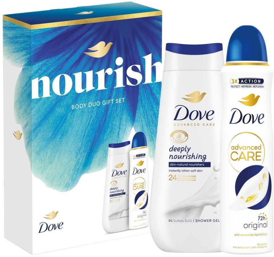 Dove Zestaw prezentowy Nourish Body Duo Gift Set 225 ml + 150 ml Zestaw Zawiera Dove Advanced Care Deeply Nourishing Żel pod prysznic 225 ml Dove Advanced Care Original Antyperspirant w aerozolu 150 ml Pielęgnacja w zestawie Nourish Body Duo Gift Set to zestaw prezentowy zawierający odżywczy żel …