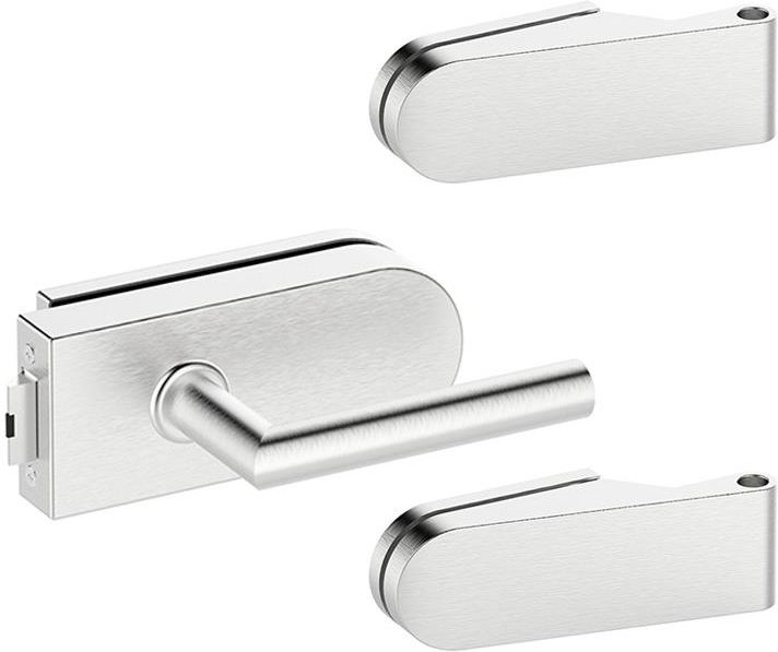 Komplet okuć do drzwi szklanych o grubości 8 mm. Bez przebicia. Stal nierdzewna AISI 304, wykończenie w kolorze inox. Drzwi o maksymalnych wymiarach: wys. 2000 mm; szer. 800 mm. Stronność: lewa / prawa. Zawiera: zamek, klamkę,2x zawiasy do szkła