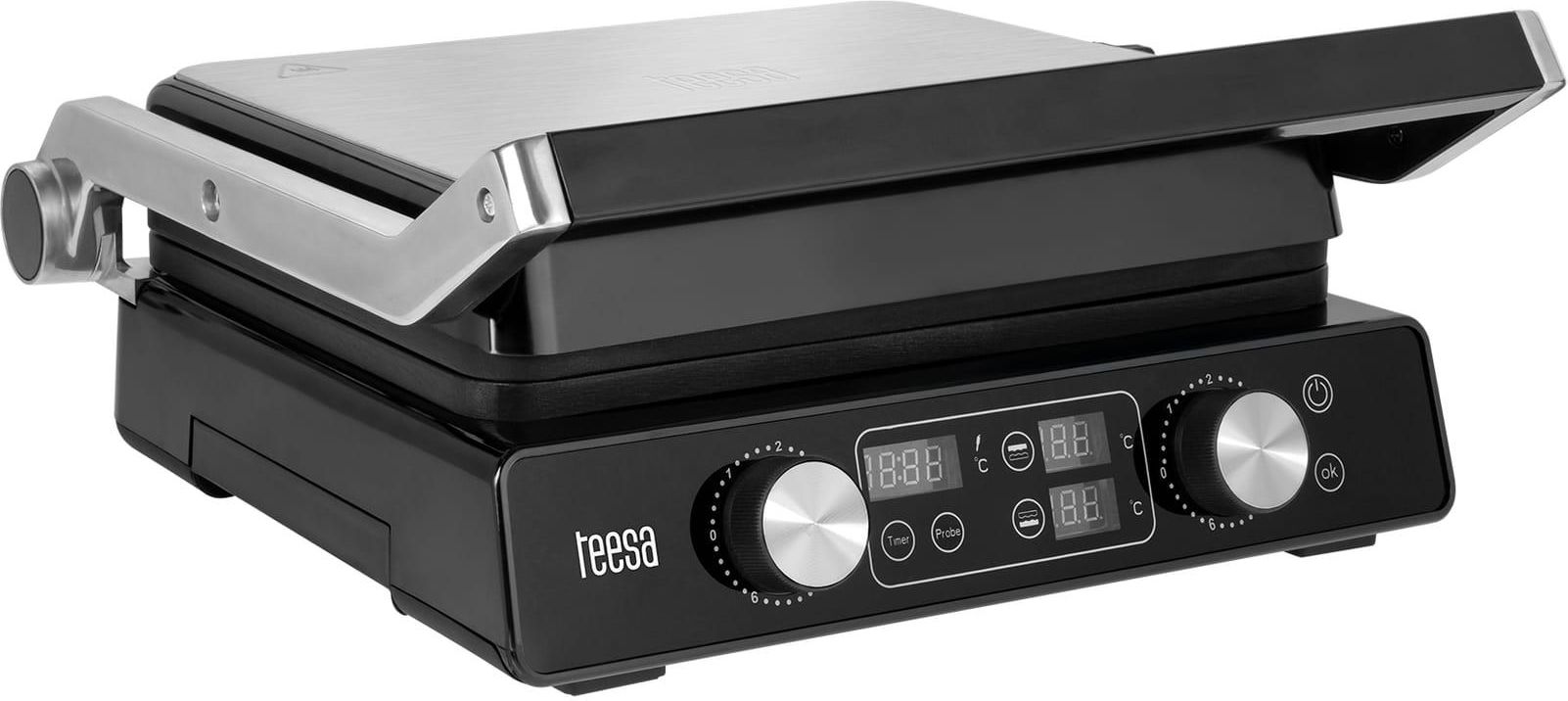 Grill elektryczny, panini grill Teesa Zorganizuj rodzinny obiad, spontaniczne spotkanie z przyjaciółmi lub leniwy wieczór we dwoje – grill elektryczny TEESA to niezawodny sposób na ciepłe, chrupiące i aromatyczne potrawy przez cały rok. Wystarczy kilka minut, by przygotować soczyste steki, złociste tosty czy perfekcyjne panini. Bez względu na pogodę, możesz cieszyć się smakiem grillowanych dań w zaciszu własnego domu. 7 pozycji grillowania Dzięki aż 7 pozycjom ustawienia płyt, panini grill Teesa pozwala precyzyjnie dopasować tryb grillowania do rodzaju potrawy – od cienkich kromek chleba po wysokie burgery czy warzywne szaszłyki. Możesz używać go jako klasycznego grilla kontaktowego, otwartego grilla stołowego czy opiekacza do kanapek. Regulacja kąta sprawia, że jedzenie jest opiekane równomiernie, a jego tekstura pozostaje idealna. Perfekcyjna kontrola temperatury Oddzielna regulacja temperatury dla każdej płyty grilla pozwala dopasować stopień nagrzania do rodzaju potrawy – dzięki temu mięso, pieczywo i warzywa opiekają się równomiernie z obu stron. Nieprzywierające, karbowane wkłady zapewniają łatwe zdejmowanie potraw bez ryzyka przypalenia czy uszkodzenia ich struktury. Precyzyjne grillowanie Zakres temperatury od 140 do 230°C pozwala przygotować zarówno chrupiące tosty, jak i solidnie wysmażone steki. Timer od 0 do 60 minut, ustawiany w 30-sekundowych odstępach, daje pełną kontrolę nad czasem obróbki. Możesz zająć się gośćmi lub rodziną, mając pewność, że grill sam wyłączy się po zakończeniu pracy. Intuicyjny panel sterowania Dwa pokrętła do ustawiania temeperatury oraz intuicyjny panel dotykowy z wyświetlaczem LED sprawia, że obsługa grilla jest szybka i wygodna. To rozwiązanie nie tylko zwiększa komfort, ale też nadaje urządzeniu nowoczesny wygląd, który będzie pasował do każdej kuchni. Czyszczenie bez wysiłku Rowki odprowadzające tłuszcz skutecznie zbierają nadmiar w trakcie grillowania, co sprawia, że potrawy są zdrowsze i mniej kaloryczne. Wyjmowana tacka ociekowa oraz wkłady, które można myć w zmywarce, znacząco skracają czas sprzątania. Po skończonym posiłku wystarczy kilka chwil, by grill był gotowy na kolejne kulinarne wyzwania. ---------- GŁÓWNE CECHY ---------- 7 pozycji grillowania Wyświetlacz LED Dotykowy panel sterowania Oddzielna regulacja temperatury dla każdej z płyt Nieprzywierające, karbowane wkłady Ruchomy zawias do równomiernego opiekania Rowki odprowadzające tłuszcz Wyjmowana tacka ociekowa Wyjmowane wkłady z możliwością mycia w zmywarce Blokada górnej pokrywy Nienagrzewający się uchwyt Ochrona przed przegrzaniem Antypoślizgowe stopki ---------- DANE TECHNICZNE ---------- Zakres temperatury: 140 – 230°C (dla obu wkładów) Timer: 0 – 60 min (w 30 sekundowych odstępach) Moc maksymalna: 2000 W Zasilanie: 220 ~ 240 V; 50-60 Hz ---------- PARAMETRY FIZYCZNE ---------- Waga: 4,2 kg Wymiary: • Urządzenie: 353 x 320 x 150 mm • Wkład: 290 x 230 mm Długość przewodu: 67 cm Jednostka miary: szt.