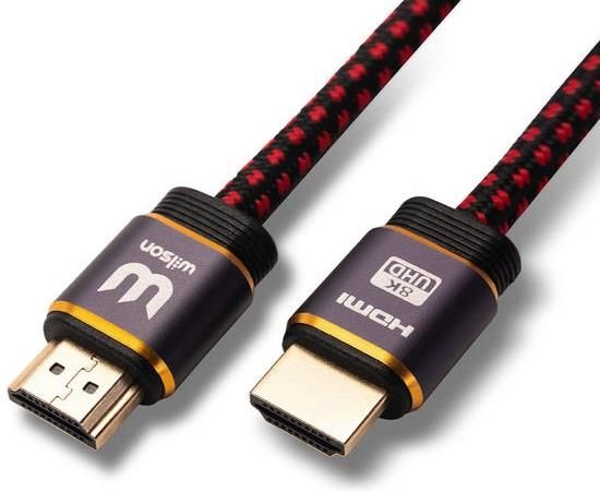 Wilson Premium HDMI 2.1 8K - przewód HDMI/HDMI o długości 1,5m Produkt pochodzi od oficjalnego dystrybutora Wilson na Polskę. Ultraszybki kabel HDMI 8K z Ethernet Wilson HDMI Premium jest wysokiej jakości kablem połączeniowym umożliwia przesyłanie obrazu w najwyższej jakości 8K z Twoich ulubionych urządzeń takich jak konsola do gier, komputer czy odtwarzacz multimedialny. Dzięki przepustowości na poziomie 48 Gbps, kabel Wilson HDMI Premium gwarantuje możliwość oglądania obrazu w rozdzielczości 8K przy częstotliwości 60Hz lub 4K przy częstotliwości 120Hz. Kabel Wilson HDMI Premium jest zgodny z wymaganiami najnowszego standardu 2.1, ale jest również wstecznie kompatybilny ze starszymi standardami HDMI (1.3 / 1.4 / 2.0 / 2.0a / 2.0b). Dzięki temu masz pewność, że kabel będzie odpowiedni do podłączenia wszystkich urządzeń w Twoim systemie. Mocna i trwała osłona z PVC, posiadająca dodatkowe ekranowanie, chroni przesyłany sygnał przed zewnętrznymi zakłóceniami, co zapewnia jego stabilność i minimalizuje utratę jakości. Wtyki kabla są pokryte 24 karatowym złotem, a ich precyzyjna konstrukcja i wysoka jakość montażu zapewniają stabilne połączenie mechaniczne po podłączeniu do współpracujących urządzeń, niezależnie od kąta pod jakim zostaną podłączone. Ogólna charakterystyka produktu superwysoka prędkość transmisji sygnału do 48 Gbps kompatybilność zarówno z najnowszym standardem jak i wsteczna (1.3/1.4/2.0/2.0a/2.0b/ 2.1) wsparcie dla: 8K przy 60 Hz, 4K przy 120 Hz, oraz rozdzielczości do 10K obsługa formatów Dynamic HDR eARC (Enhanced Audio Return Channel) wsparcie Deep Color obsługa sygnału 3D krótkie wtyczki zajmujące mniej miejsca z tyłu urządzenia pozłacane wtyki wysoka wytrzymałość osłony