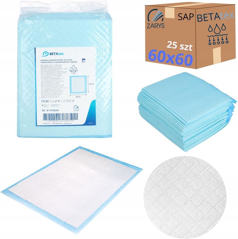 PODKŁAD CHŁONNY BETAtex + z SUPERABSORBENTEM 60 x 60 cm / 25 szt. by ZARYS wymiar: 60x60 cm chłonność: 560 ml opakowanie: 1x25 sztuk producent: ZARYS Podkłady mają szereg zastosowań i świetnie sprawdzają się wszędzie tam gdzie trzeba zabezpieczyć żądaną powierzchnie. Sprawdzają się między innymi dla kobiet w okresie połogu, do przewijania dzieci, dla osób starszych oraz domów opieki społecznej czy szpitali. Podkład z zewnątrz pokryty jest folią gwarantującą dużą wytrzymałość na rozerwanie, wewnątrz znajduje się podkład celulozowo-włókniowo z wytłoczeniami w kształcie rombu co gwarantuje stabilność podkładu. Wyrób medyczny klasy I zgodny z Rozporządzeniem PE i Rady (UE) 2017/745 (MDR) WŁAŚCIOWŚCI absorbcja i zatrzymanie płynów wykonany z 5 warstw odporny na rozrywanie również w trudnych warunkach opatentowana technologia większą chłonność niż tradycyjne produkty zapewnia lepsze samopoczucie pacjentów umożliwiając suchy i spokojny sen kolor: niebieski ZASTOSOWANIE wszystkie obszary szpitala domy opieki hospicja zakłady opieki paliatywnej dla osób starszych dla kobiet w ciąży do przewijania dzieci PODKŁAD JEDNORAZOWY wymiar: 60x60 cm / chłonność: 560 ml Na tej aukcji dokonujesz zakupu 1 opakowania podkładu jednorazowego o wymiarze: 60x60 cm (1 opakowanie zawiera 25 szt.) Aukcja dotyczy 25 szt. podkładu Interesuje Cię inny rozmiar - wybierz odpowiedni rozmiar w wariantowości produktu. Dostępne rozmiary podkładów 60x40 cm - chłonność 410 ml 60x60 cm - chłonność 560 ml 60x90 cm - chłonność 910 ml DANE TECHNICZNE Wymiar podkładu: 60 cm x 60 cm Powierzchnia chłonna podkładu: 55 cm x 55 cm Chłonność: 560 ml *tolerancja wymiarów wynosi +/- 5%