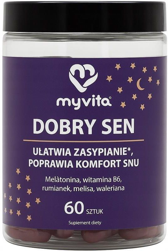 MyVita Naturalne żelki Dobry Sen MyVita Naturalne żelki Dobry Sen to suplement diety przeznaczony dla osób dorosłych, w tym wegan i wegetarian. Pozbawione żelatyny, oleju palmowego, sztucznych dodatków i wypełniaczy żelki Dobry Sen zawierają kompozycję składników, które w natruralny sposób redukują stres, ułatwiają zasypianie i poprawiają komfort snu. Składniki Co zawierają żelki MyVita Dobry Sen? Składnik, 1 żelka, %RWS* Rumianek pospolity, 17 mg, - Kozłek lekarski, 17 mg, - Melisa lekarska, 16 mg, - Witamina B6, 1,4 mg, 100% RWS* Melatonina, 1 mg, - *RWS - Referencyjna Wartość Spożycia Składniki: syrop glukozowy, cukier, woda, substancja żelująca: pektyna, ekstrakt z kwiatów rumianku pospolitego (Matricaria chamomilla), ekstrakt z korzenia kozłka lekarskiego (Valeriana officinalis), ekstrakt z liści melisy lekarskiej (Melissa officinalis), regulatory kwasowości: kwas cytrynowy i cytrynian sodu, spirulina (Spirulina platensis), barwnik roślinny: antocyjany, aromat malinowy naturalnego pochodzenia, olej kokosowy, chlorowodorek pirydoksyny, melatonina, substancja glazurująca: wosk carnauba. Właściwości składników Żelki z melatoniną, witaminą B6 i ekstraktami roślinnymi Naturalne składniki zawarte w żelkach MyVita Dobry sen zapewniają wyborny smak oraz odpowiednie ilości substancji aktywnych stosowanych przy trudnościach w zasypianiu. Multipreparat zawierający melatoninę, kozłek lekarski, melisę lekarską i rumianek pospolity, w naturalny sposób pomaga w zasypianiu, redukuje stres, odpręża, wspiera regenerację organizmu i poprawia jakość snu. Produkt nie zawiera żelatyny i sztucznych dodatków. Melatonina przyczynia się do skrócenia czasu potrzebnego na zaśnięcie, korzystnie wpływa w przypadku spożycia 1 mg na krótko przed snem. Zalecane dzienne spożycie Jak stosować MyVita Naturalne żelki Dobry Sen? Dorośli: 1 żelka dziennie 30 minut przed snem. Produkt przeznaczony dla osób dorosłych. Korzystne działanie występuje w przypadku spożycia 1 mg melatoniny na krótko (30 min) przed pójściem spać. Dodatkowe Preparat należy przechowywać w temperaturze pokojowej, w sposób niedostępny dla dzieci. Ostrzeżenia Nie należy przekraczać zalecanej porcji do spożycia w ciągu dnia. Dla utrzymania prawidłowego stanu zdrowia należy stosować zróżnicowaną dietę i prowadzić zdrowy tryb życia. Suplement diety nie może być stosowany jako substytut (zamiennik) zróżnicowanej diety. Suplement diety jest środkiem spożywczym, którego celem jest uzupełnienie normalnej diety. Suplement diety nie ma właściwości leczniczych. Przechowywać w sposób niedostępny dla małych dzieci. Nie zaleca się dzieciom, kobietom w ciąży, karmiącym piersią. Osoby przyjmujące leki przed zastosowaniem suplementu powinny skonsultować się z lekarzem lub farmaceutą. Nie należy stosować w przypadku nadwrażliwości na którykolwiek ze składników suplementu. Przed zastosowaniem produktu należy zapoznać się z dokładnymi informacjami podanymi na opakowaniu lub załączonej ulotce.