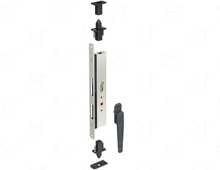 Zestaw 2-punktowego zamka ryglowego do blokowania skrzydeł środkowych w drzwiach harmonijkowych. Zawiera:1x dwupunktowy zamek; 1x klamka na trzpień 7 mm; 1x zestaw rygli z gniazdami. Do zamówienia osobno: wkładka bębenkowa; pręty ryglujące Masa 1,1 kg/kpl